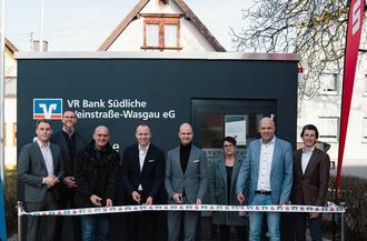 Bürgermeister Karl Dieter Wünstel und Landrat Martin Brandl waren bei der Eröffnung mit dabei, Ortsbürgermeister Steffen Scherer war terminlich verhindert. Sie bedanken sich bei der VR Bank Südliche Weinstraße-Wasgau eG und der Sparkasse Südpfalz, die mit der Installation des sprengsicheren Pavillons weiterhin eine sichere und effiziente Abwicklung von Geldgeschäften ermöglichen.