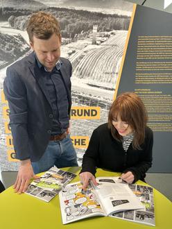 Museumsleiter Dr. Christian Stöber und Mitarbeiterin Madlen Beckmann beim Blättern durch das neue Magazin zur Neugestaltung des Grenzmuseums Schifflersgrund