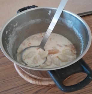 Zutaten Birnensuppe: Milch, Kartoffelkloßteig (nach Belieben mit etwas Grieß), Birnen, kross gebratene Speckgrieben, Salz