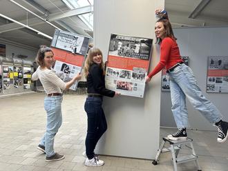 Frauenpower im Grenzmuseum Schiffersgrund: Die Mitarbeiterinnen Anne Vaupel-Meier, Victoria Göbel und Madlen Beckmann (v.l.n.r.) beim Aufbau der neuen Sonderausstellung, Foto: Weicheng Chiang, Grenzmuseum Schifflersgrund.