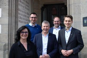 v.l. Fördermittelmanagerin Veronika Weniger mit den vier Bürgermeistern Lukas Sittel (Witzenhausen), Dirk Oetzel (Hessisch Lichtenau), Frank Hix (Bad Sooden-Allendorf) und Finn Thomsen (Großalmerode)