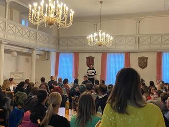 Carina Faßhauer begrüßt die etwa 100 Gäste, Austauschschüler*innen aus Landi und deren Gastfamilien, zu einem gemeinschaftlichen Abend. Foto: Heidi Giese.