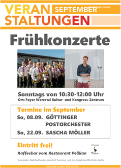 | 08.09.2024 | 10:30-12:00 Uhr | Frühkonzert mit dem Göttinger Postorchester |Foyer Werratal Kultur- und Kongress-Zentrum |