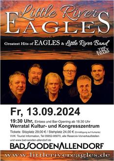 | 13.09.2024 | 19:30 Uhr | Little River Eaglesthe Tribute Of The Fantastic Music Of The Eagles |werratal Kultur- und Kongresszentrum |