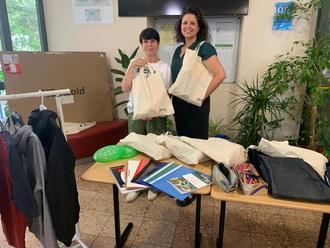 Und prompt haben die Engel des Fördervereins wohlverdient den Sozialpreis gewonnen. Das Kulturforum hat daraufhin die unglaubliche Summe von 1.000 Euro gespendet, sodass der Förderverein nicht nur Taschen für die „soziale Kleiderstange” packen (bestehend aus Unterrichtsmaterial und Sportbekleidung, siehe Bild), sondern das gespendete Geld ebenfalls für die „Gesunde Pause“ verwenden konnte, in der den SchülerInnen in der Hausaufgabenbetreuung frisches Obst angeboten wird.