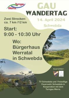am 14. April findet der Frühjahrsgauwandertag des Turngau Werra in Schwebda statt. Es wird eine kürzere Strecke (7 km) und eine längere Strecke (12 km) geben.