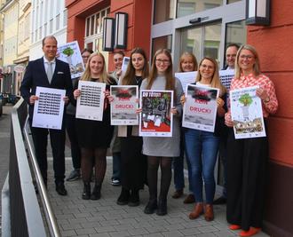 (von links) Kreisbeigeordneter Dr. Philipp Kanzow, die Klimascouts: Antonia Halt, Maxima Strube, Hannah Beck, Laura Döhle und Emely Albrecht, Gabriele Maxisch (Abfallwirtschaft und Klimaschutz WMK), Lidia Graz (Personalentwicklung WMK), Holger Schülbe (Abfallwirtschaft und Klimaschutz WMK) und Landrätin Nicole Rathgeber