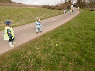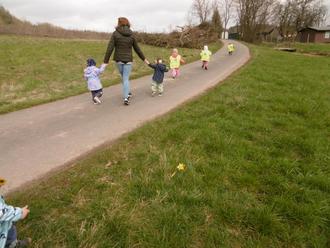 Im Anschluss stiegen sie mit dem Ei durch die bunten Reifen, dabei färbten sich die Eier rot, blau oder grün. Am Ende wurde das bunte Osterei auf das Schwungtuch gelegt. Beim Spaziergang durch die Wiesen und Felder hielten die Kinder Ausschau nach dem Osterhasen. Die Hasen wurden nicht entdeckt. Doch eine Osterglocke wurde gefunden und ganz viele Äste für das Osterfeuer.