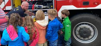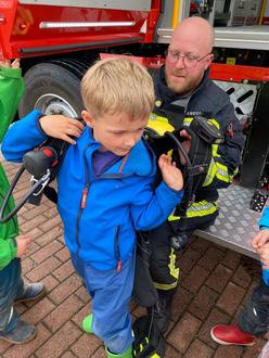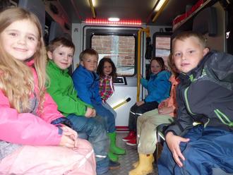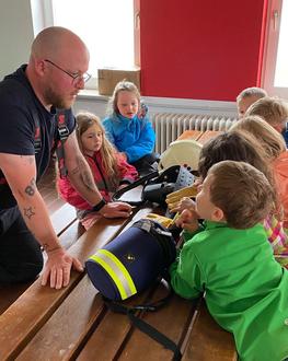 Herr Kuckuck erklärte die einzelnen Gerätschaften und deren Funktion auf dem Auto. Die Kinder durften erfahren, wie schwer eigentlich so eine Sauerstoffmaske ist und dass das Auto nicht nur Geräte und Schläuche an Bord hat, sondern auch einen großen Tank mit jeder Menge Wasser…