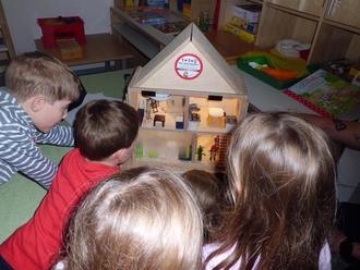 Anhand einer Geschichte lernten sie die W-Fragen und wie man sich im Notfall verhält. Anschließend wurde ihnen anhand eines „speziellen“ Puppenhauses gezeigt, wie eine Rauchentwicklung im Haus entstehen kann.