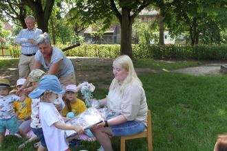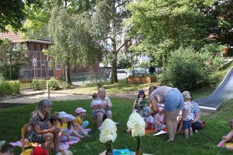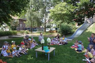 Bei herrlichem Sonnenschein trafen wir uns auf unserem Kita-Spielpatz, um den beiden ein (extra für sie gedichtetes) Lied zu singen und sie mit ein paar netten Worten durch unseren Bürgermeister Herrn Dr. Bergner, der Kita-Leitung Frau Flügel und dem Elternbeiratsvorsitzenden Herrn Ludwig zu verabschieden.