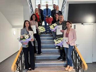 Landrätin Nicole Rathgeber ehrte fünf Mitarbeiterinnen anlässlich ihres 25-jährigen Dienstjubiläums: (v.l.n.r.) Jubilarin Jennifer Pankratz, Jubilarin Ann-Katrin Schober, Landrätin Nicole Rathgeber, Erster Kreisbeigeordneter Friedel Lenze, Verwaltungsleiter Martin Glöckner, Leiter Fachdienst Personal Manuel Thalmann, Kreisbeigeordneter Dr. Philipp Kanzow, Jubilarin Ivonne Stockheim, Jubilarin Jenny Getze und Jubilarin Myriam Lamotte-Heibrock