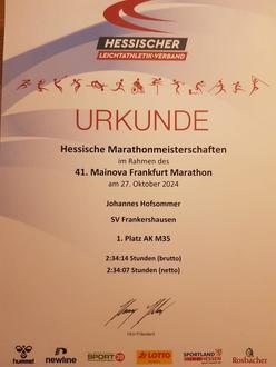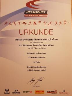 Am letzten Oktober-Wochenende fand die 41. Auflage des ältesten deutschen City-Marathonlaufes statt. Über 25.000 Teilnehmer waren an diesem Wochenende in Frankfurt am Start. Auch für Johannes Hofsommer war es erneut der Saisonhöhepunkt. Der Langstreckenläufer im Trikot des SV Blau Weiß Frankershausen absolvierte die 42,195 km in der Zeit von 2:34:07 Std. Mit dieser Zeit belegte er in der Gesamtwertung den Platz 115, bzw. wurde dritter innerhalb der Wertung zur hessischen Marathon-Meisterschaft und konnte erneut überzeugen. Am Ende trug er insgesamt drei Medaillen um den Hals. Neben der Medaille für die erfolgreiche Teilnahme gab es noch Bronze für den dritten Platz, sowie Gold für den ersten Platz in der Alterswertung M35 der hessischen Marathonmeisterschaften.