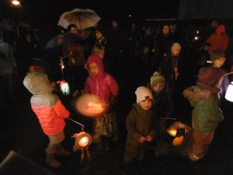 Die Wacholderzwerge versammelten sich vor der Tür und sangen die Laternenlieder, die sie wochenlang geübt hatten. Nach dem Ständchen ging es schnell weiter durch den Nieselregen bis zur Feuerwehrstation.