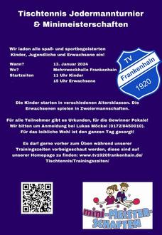 Tischtennis hat jeder schon mal gespielt - ob in der Schule beim Rundlauf mit Mitschülern, im Schwimmbad mit Freunden oder auf dem Dachboden mit den Eltern und Großeltern. Wer Lust hat, den Schläger einmal in einer Halle unter „professionellen“ Bedingungen zu schwingen, laden wir herzlich am 13. Januar in die Mehrzweckhalle nach Frankenhain ein.