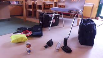 Herr Schilling ein Polizist (Jugendverkehrsschule), zeigte uns was die Polizei für ein Equipment bei sich hat, bzw. sich im Einsatzwagen befindet. Er zeigte uns die Polizeiweste, Taschenlampe, Zollstock, Warnweste, Polizeikelle, Pfefferspray, Teleskopschlagstock und das Maskottchen „Leon den Löwen“.