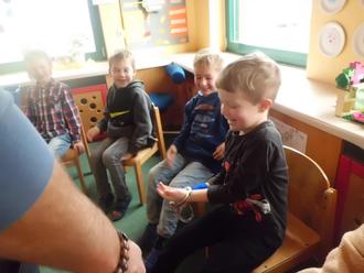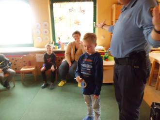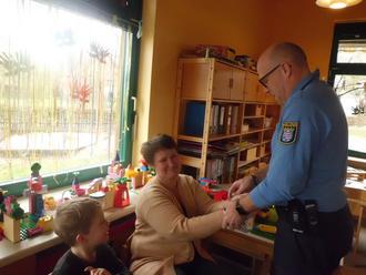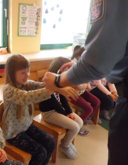 Die Handschellen durfte sich jeder von uns „anlegen“ lassen. Das „ablegen“ ging sehr schnell, ganz von allein. Da Handschellen nicht für Kinderhände geeignet sind, weil Kinder nicht verhaftet werden können. Bei Frau Flügel brauchte Herr Schilling dann aber doch den Schlüssel, um sie wieder „frei“ zu lassen.