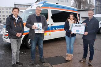 Eugen Monsch (von links) und Martin Geilhorn von der Kraftwerksgruppe Pumpspeicher in Edertal mit Wünschewagen-Koordinatorin Larissa Groffmann und Sascha Mardorf, Leiter der Erste-Hilfe-Ausbildung beim ASB-Regionalverband in Kassel, vor dem „Wünschewagen Nordhessen“.
