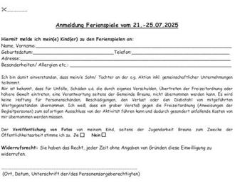 Die Anmeldungen können ab sofort in der Gemeindeverwaltung Breuna Team Kasse/Buchhaltung abgegeben werden.