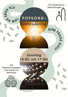 | 17:00 Uhr | Popsong-Gottesdienst mit Dämmerschoppen und Snacks im Anschluss, im Kerkenhuus Oberlistingen |