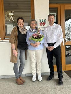 Das Foto zeigt die verabschiedete Kollegin, Christel Schmale, umrahmt von Petra Winter und Bürgermeister Jens Wiegand.