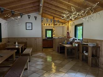Küche und Toilette sowie Sitzgelegenheiten (auch Stehtisch und Bierzeltgarnituren) sind vorhanden.