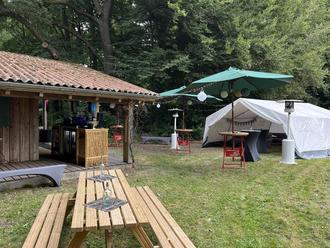 Die Wiese davor bietet außerdem genügend Platz für ein großes Zelt, so dass man zusätzlich mit Hütte und überdachter Veranda, Platz für viele Gäste ermöglichen kann.