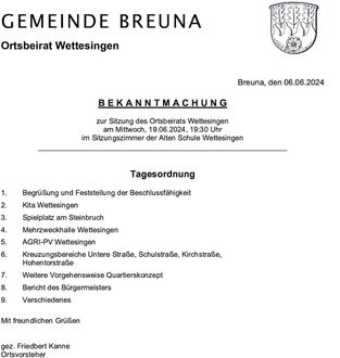 zur Sitzung des Ortsbeirats Wettesingen am Mittwoch, 19.06.2024, 19:30 Uhr im Sitzungszimmer der Alten Schule Wettesingen