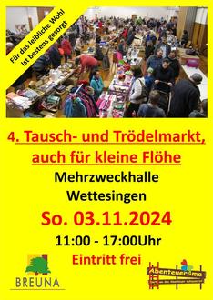 Auch in diesem organisiert die Jugendarbeit wieder einen Flohmarkt. Die letzten drei Jahre haben gezeigt, dass der Flohmarkt von Standbetreibern und auch Besuchern gut angenommen wird und sich bisher jeder wohl gefühlt hat. Die entspannte, herzliche und einladende Atmosphäre haben viel gelobt und waren von ihr angetan. Einige verbrachten gerade im Cafe doch einige Stunden ihrer Zeit. Harmonisch ging es auch unter den Ausstellern zu. Damit wir auch in diesem Jahr wieder diese Atmosphäre schaffen können, benötigen als erstes euch. Damit sind die Standbetreiber*innen und hier vor allem auch unsere Kinder gemeint. Natürlich wird es auch in diesem Jahr wieder einen großen Kinderbereich geben. Die Landfrauen aus Listingen werden uns wieder mit ihren leckeren Kuchen verwöhnen und für das leibliche Wohl außerhalb vom Kaffee und Kuchen ist auch wieder gesorgt. Bei gutem Wetter bieten wir für die "Kleinen" wieder Stockbrotgrillen und die Hüpfburg an. Für einen Stand anmelden geht ab sofort. Da es uns als Jugendarbeit nicht ums Geld verdienen geht, sondern eher darum, gemeinsam etwas ins Leben zu rufen bei dem viele Menschen die Möglichkeit haben sich in einer schönen, stressfreien Umgebung zu begegnen sowie den Jugendlichen eine Aufgabe und dadurch ein gemeinsames Ziel zu geben, werden wir auch in diesem Jahr die Preise nicht erhöhen. Der Eintritt ist nach wie vor kostenfrei und die Standgebühren betragen 2,50€ pro Meter für Bürger der Großgemeinde Breuna, für alle anderen beträgt die Gebühr 5,00€ pro Meter. Sämtliche Einnahmen kommen der Jugendarbeit zu Gute, daher freuen wir uns auch über jede Spende, die wir während des Tausch- und Trödelmarktes in unserer Spendendose landet. Tische können in der Regel wieder von uns gestellt werden. Es wird auch wieder einen Bereich für den Kinderflohmarkt geben. Die Kinderstände sind kostenfrei. Anmeldungen sind ab sofort möglich. Entweder per Telefon: 0173-4629321, oder unter dieser Nummer per Whattsapp oder Signal, oder per E-Mail unter info@a4ma.de. Für weitere Fragen stehen wir, wie immer, gerne zur Verfügung.