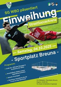 Die SG Wettesingen-Breuna-Oberlistingen (SG WBO) lädt herzlich zur feierlichen Einweihung der neuen StreetSoccerArena auf dem Sportplatz Breuna ein.
