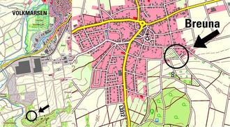 Das verfahrensgegenständliche Plangebiet besteht aus zwei Geltungsberiechen. Geltungsbereich I befindet sich am südöstlichen Ortsrand von Breuna und umfasst die Entwicklungsabsichten der Gemeinde Breuna. Geltungsbereich II umfasst die Ausgleichsmaßnahme des verbindlichen Bauleitplanes. Der Geltungsbereich der. Änderung des Flächennutzungsplanes ist deckungsgleich mit dem Geltungsbereich I.