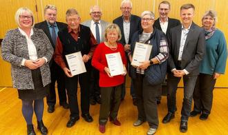 Ehrengäste und geehrte Mitglieder: von links hintere Reihe: Herbert Panow, Dr. Günter Schnell, Friedbert Kanne, Helmut Flörke und Liane Kleinhans, vordere Reihe: Silke Engler, Karl-Günther Viering, Karin Rappe, Elke Grimm und Jens Wiegand