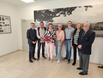 Das Foto zeigt die Geehrte umrahmt von Bürgermeister Jens Wiegand (links), dem Vorsitzenden des DLRG-Ortsverband Breuna, Klaus-Dieter Reitenberger (rechts) sowie anwesenden Gästen