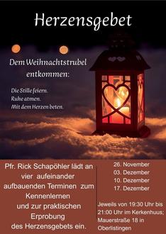 An vier Abenden im Advent bietet Pfarrer Rick Schapöhler die Möglichkeit, das Herzensgebet kennen zu lernen und in einem geschützten Raum eingebettet in einer Andacht zu erproben.