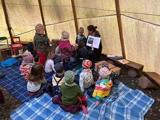„Liebes Mäuschen, kleine Zwerge schufen sich hier ein winziges Paradies, aber immer mit einem achtsamen Blick auf unsere Natur und die Tiere, die hier leben. Täglich erfreuen sich hier kleine Waldwichtel ihren Balancierstämmen, Hängematten, Kletternetzen, Erdlöcher und Matschelöcher sowie ihrem selbst angelegtem Obst- und Gemüsebeet. Der Bauwagen und das Tippi stehen auch noch zur Verfügung. Ziemlich beliebt sind der Morgen- und der Singkreis, die der Waldwichtel leiten darf. Zwischendrin wird herumgetobt und gebastelt. Manchmal wird auch Yoga gemacht, sich ausgeruht, Bücher gelesen oder auch mal Spiele gespielt.
