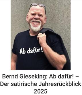 Der Tränkenfestverein Breuna e. V. freut sich, auch in diesem Jahr den beliebten Kabarettisten, Bestsellerautor und Meister des satirischen Jahresrückblicks Bernd Gieseking begrüßen zu dürfen. Bereits zum 25. Mal gastiert er in Breuna und präsentiert sein aktuelles Programm „Ab dafür!“, eine rasante, humorvolle und pointierte Rückschau auf die Ereignisse der vergangenen zwölf Monate.