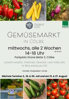 Ab dem 18. Juni dürfen sich die Bewohnerinnen und Bewohner von Cölbe auf einenvneuen, regelmäßigen Gemüsemarkt freuen. Der Bioland-Gemüsebau „Siebenhof“ ausvGinseldorf bringt alle zwei Wochen frisches Biogemüse, Kräuter und hofeigene Produktevdirekt nach Cölbe. Unterstützt wird das Projekt von der Gemeinde Cölbe.