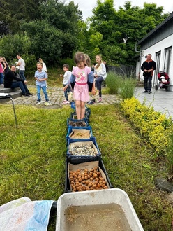 Nach dem Gottesdienst folgte der gesellige Teil. Ein großes Kuchenbuffet lud zum Verweilen im Lindenhof ein. Danach ging es auch schon mit dem Kinderprogramm los. Gestartet wurde mit verschiedenen Outdoorspielen und einem Barfußpfad. Parallel haben die Kinder gemeinsam beobachtet, wie ein Baum wächst, in dem sie symbolisch einen Fingerabdruck als Baumblatt auf einem Bild mit einem Baum hinterlassen haben. Besonders schön war, dass die Kinder das Bild mit dem Baum vorher im Rahmen des Kindergottesdienstes selbst gemalt hatten.