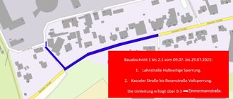 | 16.07.2025 bis 29.07.2025 | Kasseler Str./Lahnstr. bis Ecke Rosenstraße | Vollsperrung |
