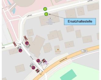 Ersatzbushaltestelle für den Bauabschnitt 2.1 in der Lahnstraße (Höhe Hausnummer 19-21); diese wird vom 16.07. bis 07.08.2025 angedient.