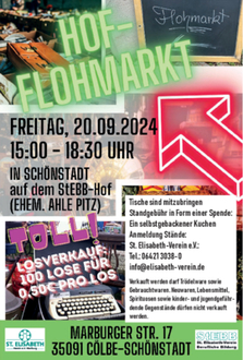 Der Hofflohmarkt wird von StEBB – der Beruflichen Bildung im St. Elisabeth-Verein – veranstaltet. Seit 2016 ist der Hof „Ahle Pitz“ ein wichtiger Bildungs- und Erfahrungsort für Jugendliche aus den Einrichtungen des Vereins. Durch den Besuch des Marktes unterstützen Sie nicht nur lokale Initiativen, sondern helfen auch dabei, die berufliche Bildung junger Menschen zu fördern.