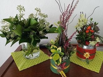 Ute Wack brachte ins Café VergissMeinNicht viele verschiedene Utensilien mit und hatte bereits kleine Metalldosen mit Steckschwamm vorbereitet. Sie gab Anregungen, wie man die Materialien arrangiert und so entstanden, je nach Naturell der Bastler*innen, die unterschiedlichsten Kompositionen, die jeder mit nach Hause nehmen konnte.