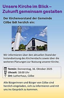 Wegen festgestellten Schäden in der Dachkonstruktion der ev. Kirche Cölbe, ist bis auf weiteres das gesamte Kirchengelände gesperrt.