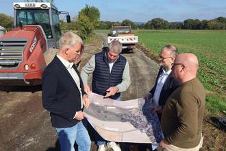 Karsten Dittmar, Leiter des Fachbereichs „Planen und Bauen“ bei der Stadt Marburg, Bauleiter Dirk Wind, Landrat Jens Womelsdorf und Cölbes Bürgermeister Dr. Jens Ried (v.l.) sprechen über den Fortschritt der Bauarbeiten, um eine direkte Anbindung für den Radverkehr zwischen Ginseldorf und Bürgerln wiederherzustellen.