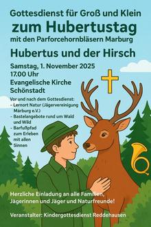 Am Samstag, den 1. November 2025 um 17.00 Uhr lädt der Kindergottesdienst Reddehausen zu einem besonderen Gottesdienst für Groß und Klein in die evangelische Kirche in Schönstadt ein. Unter dem Motto „Hubertus und der Hirsch“ dreht sich an diesem Nachmittag alles um die Natur, die Tiere des Waldes und die Verantwortung des Menschen für die Schöpfung. Musikalisch begleitet wird der Gottesdienst von den Parforcehornbläsern Marburg, die mit ihren Jagdhörnern eine feierliche und zugleich stimmungsvolle Atmosphäre schaffen.