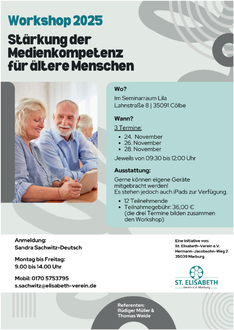 Die bisherigen Workshops waren äußerst beliebt und ausgebucht, was den großen Erfolg dieser Angebote unterstreicht. Aufgrund der positiven Resonanz wird die Workshop-Reihe zum Thema Medienkompetenz für ältere Menschen – und nicht nur für diese – weiterhin angeboten. Sie besteht jeweils aus drei Terminen, die zusammen eine umfassende Einheit bilden und den Teilnehmenden die Möglichkeit geben, ihre Kompetenzen gezielt zu erweitern. Der Ort ist ebenfalls geblieben: der Seminarraum „Lila“ des St. Elisabeth-Vereins (Lahnstraße 8, 35091 Cölbe).