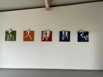 Die künstlerische Gestaltung besteht aus mehreren farbintensiven Bildtableaus, die auf der Wand in der Loge installiert sind. Ergänzt werden diese durch figürliche Elemente in Form von Läuferdarstellungen, die in unterschiedlichen Bewegungsphasen gezeigt werden. Die Kombination aus Linienführung, Farbgestaltung und plastischen Figuren erzeugt eine eindrucksvolle Darstellung von Bewegung und Dynamik und macht den sportlichen Charakter des Stadions unmittelbar erlebbar.