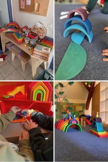 Schon seit ca. einem Jahr bilden sich die Erzieherinnen unserer Kita zum Thema „Freies Spielmaterial" weiter. Hierzu konnten wir auch in einer Kita in Landau hospitieren, die das Konzept schon anwendet. Schnell waren wir überzeugt und es stand fest, dass auch unser Spielmaterial verändert werden muss. Solches Spielmaterial ist jedoch leider nicht ganz günstig. Deshalb haben wir über ein Jahr viel Geld gespart und beispielsweise Kuchenverkauf an unserem Erntedankfest angeboten.