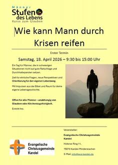 | Stufen des Lebens richtet sich an alle Interessierten, die - mit oder ohne Vorkenntnisse - anhand biblischer Texte ihrem eigenen Leben auf die Spur kommen wollen. In der Mittagspause wird es ein einfaches Mittagessen geben. |