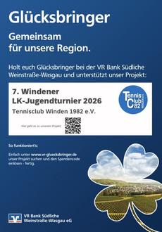 Über die Initiative „Glücksbringer" der VR Bank Südliche Weinstraße-Wasgau eG sammeln wir Spenden, um unser Turnier realisieren zu können. Wir rufen alle Mitglieder, Tennisbegeisterte und Winnemer auf, uns und das Turnier zu unterstützen.